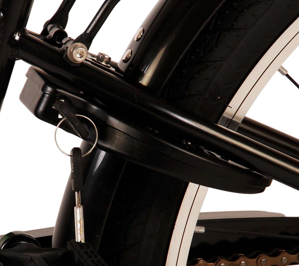 Veiligheid staat voorop! Daarom heeft deze gave fiets een handrem en terugtraprem en verlichting op batterij voor en achter. Daarnaast heeft de fiets een leuke bel en reflectoren in de wielen. Ook aan het comfort is gedacht. De mooie zwarte Volare fiets met groene accenten heeft een luxe zacht zadel en extra zachte handvaten, een handige achterdrager, en een stevig frame dat wel tegen een stootje kan. Verder heeft de fiets een standaard zodat hij netjes blijft staan en een sterk slot. Om zo lang mogelijk van de fiets te kunnen genieten heeft deze een extra lange zadelpen waardoor de fiets nóg langer met het kind meegroeit en ook het stuur is in hoogte verstelbaar.
